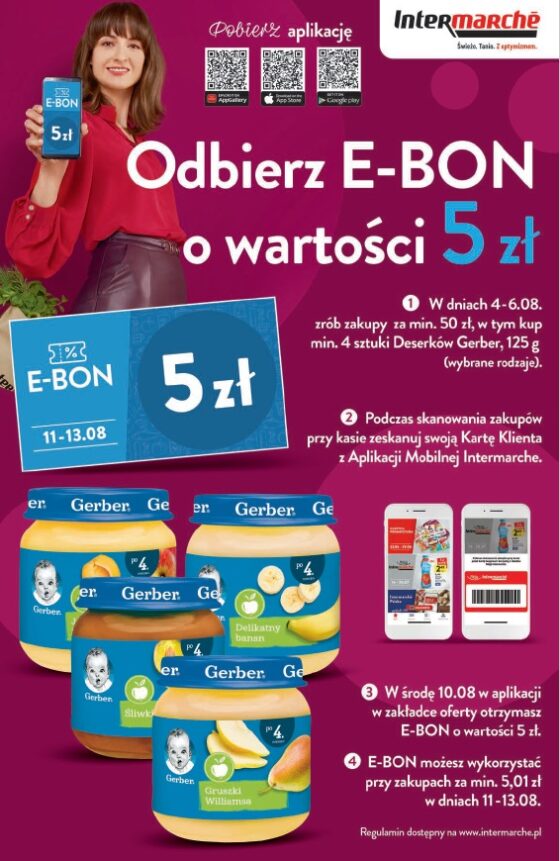 W środę 10.08 w aplikacji w zakładce oferty otrzymasz E-Bon o wartości 5zł. E-Bon jest do jednorazowego wykorzystania i możesz go wykorzystać przy zakupach za min. 5,01zł w dniach 11-13.08.