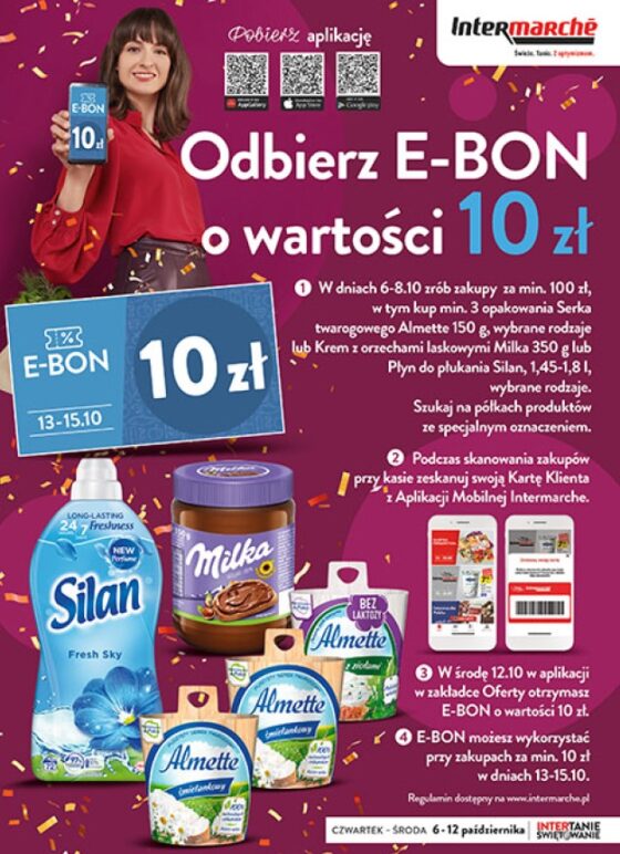 W środę 12.10 w aplikacji w zakładce oferty otrzymasz E-Bon o wartości 10zł. E-Bon jest do jednorazowego wykorzystania i możesz go wykorzystać przy zakupach za min. 10,01zł w dniach 13-15.10.