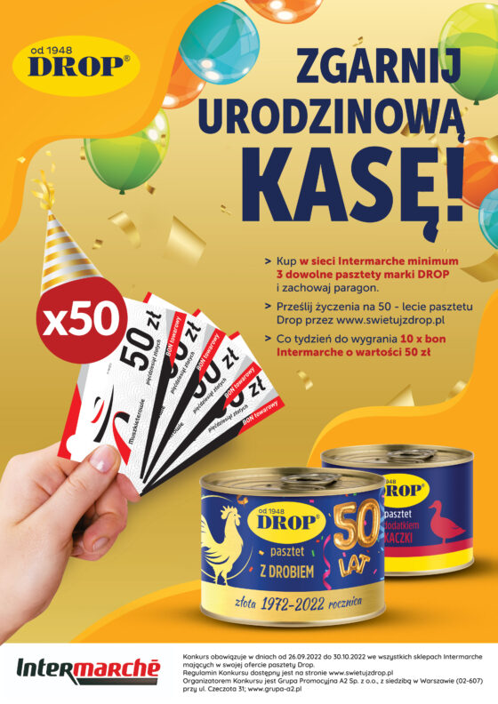 Prześlij życzenia na 50-lecie pasztetu Drop przez www.swietujzdrop.pl i graj o nagrody.