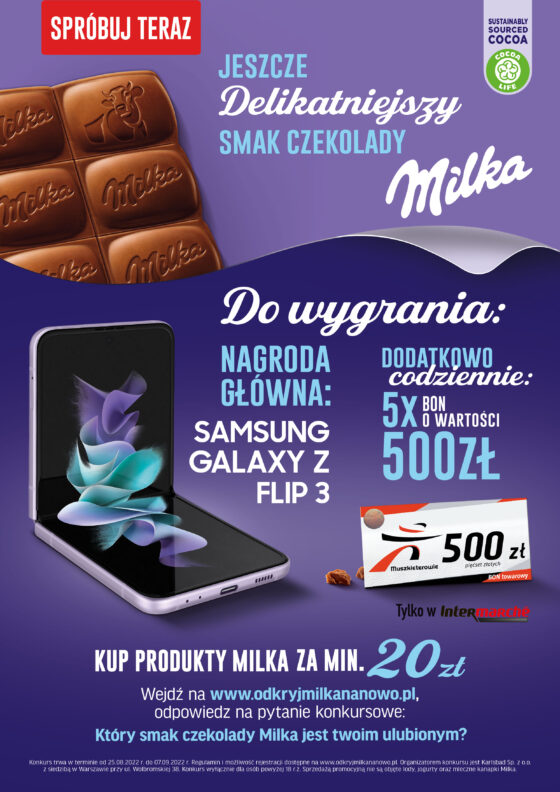 Wejdź na http://www.odkryjmilkananowo.pl i odpowiedz na pytanie konkursowe: „Który smak czekolady Milka jest Twoim ulubionym?”