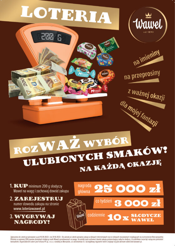 Kup minimum 200 g słodyczy Wawel na wagę i zachowaj dowód zakupu.